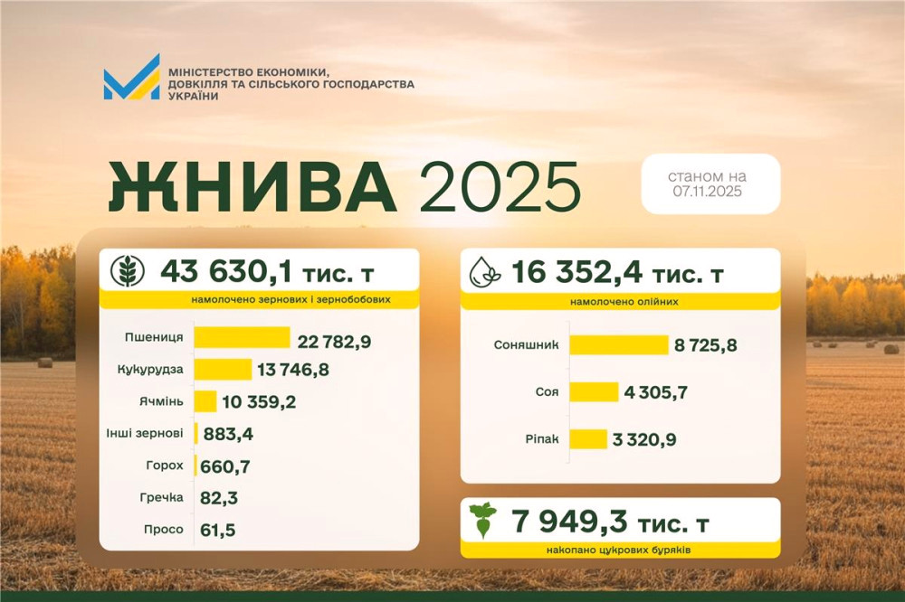 Станом на 7 листопада 2025 року в Україні зібрано 43,630 млн тонн зерна на площі 9,302 млн га, що становить 81% від загальної площі обробки. Про це повідомили в Міністерстві економіки, довкілля та сільського господарства.